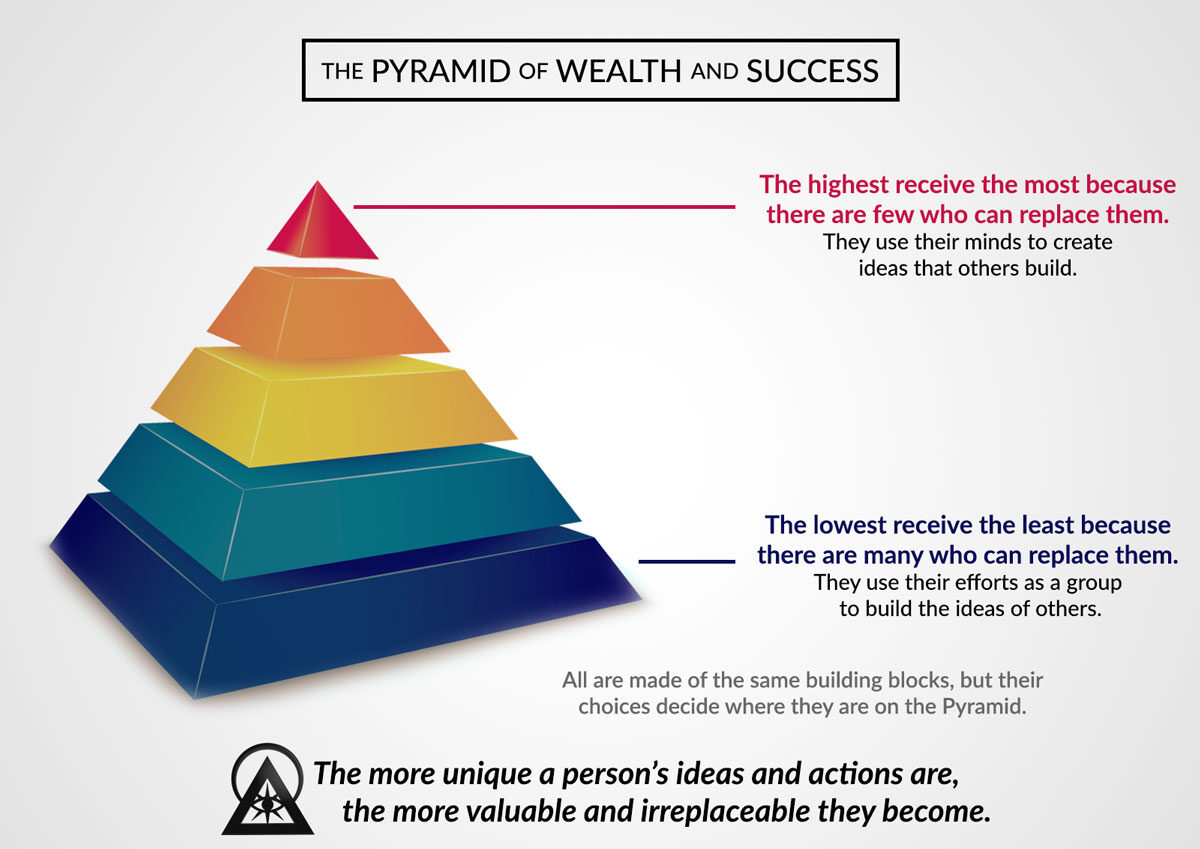 Wealth and success are like streams of water running down a pyramid. The highest receive the most because there are fewer while the lowest receive the least because there are many. Before the water can reach the bottom, first it must run through all the others above it. Though the lowest support the weight of all who are above them, they are numerous and easily replaced — unique individually, but common together. A person climbs higher by becoming less like those below them.